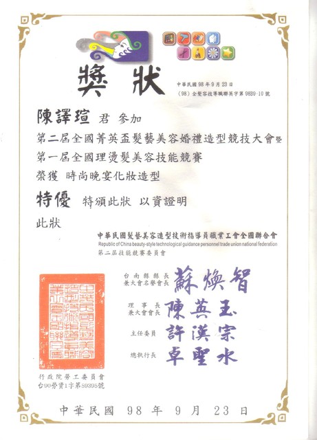還記得得知比賽消息的那天已經是報名的最後一天了,到台上念到我的名字時,心裡覺得一切努力與辛苦都值得了!當然更感謝羅敏容老師用心指導,讓我們技術躍昇,信心大增好幾倍!也要感謝我的模特兒”雪峰”全力配合,有大家支持與配合這場比賽才能順利圓滿!