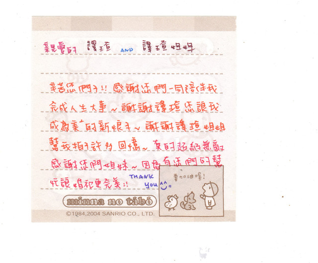 <!-- Origin Article URL: http://www.wretch.cc/blog/yishung0925/12828473 --> 新娘小可是一位很活潑又可愛的女孩,而且超客氣的啦!!一整場婚禮下來一直聽到小可不管是對譯瑄或其他朋友最常說的話就是"不好意思喔,謝謝",<br /> 能與小可認識真的很高興,談話之中發現他們家跟譯瑄的阿姨是鄰居說,一樣是從板橋搬到三峽~~呵呵,我們真的很有緣說<br /> <br /> <img src="http://pic.pimg.tw/shanci0925/1378997530-1410200659.jpg?v=1378997532"><br /> <br /> <img src="http://pic.pimg.tw/shanci0925/1378997536-63868980.jpg?v=1378997538"><br /> <br /> <img src="http://pic.pimg.tw/shanci0925/1378997541-2729555932.jpg?v=1378997542"><img src="http://pic.pimg.tw/shanci0925/1378997546-3102591588.jpg?v=1378997547">